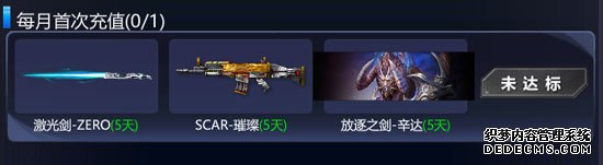 活动内容:玩家充值任意金额即可获得激光剑-ZERO(5天)、SCAR-璀璨(5天)、放逐之剑-辛达(5天)豪华组合礼包