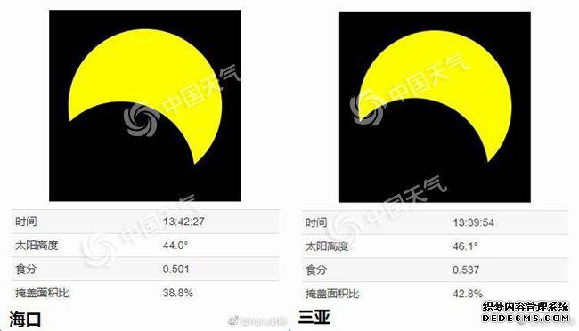 京津冀等北方大部地区以晴天为主,天气条件适宜观测,但是地理位置偏北,偏食效果并不好。只有在珠三角、海南、云南等地最为适宜观赏。以下图片显示城市为不考虑天气因素的食甚情况。