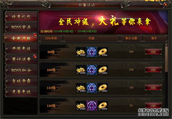 全民冲级:达到目标等级要求的玩家,可以免费领取对应奖励,奖励有数量限制,等级越高,奖励越好,但是数量越少。